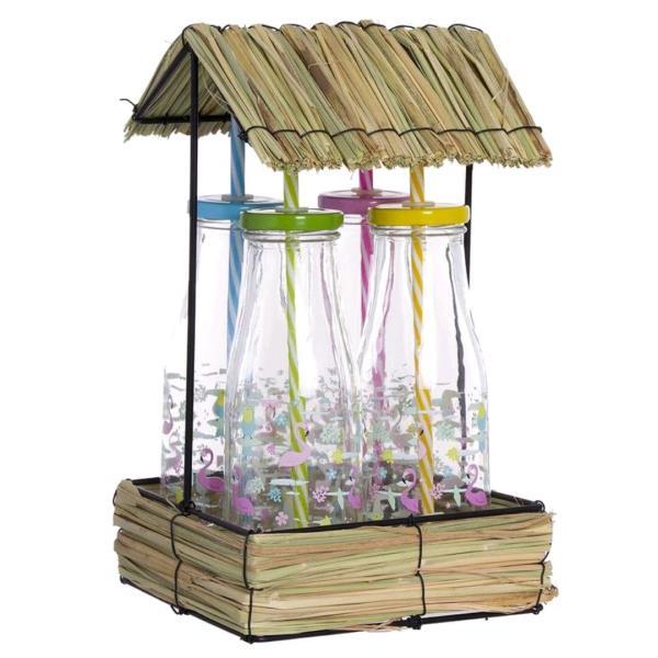 Conjunto de 4 tarros de cristal decorados con tapa de metal y cañita. Vienen presentados en palapa. Medidas 16x27,5cm.