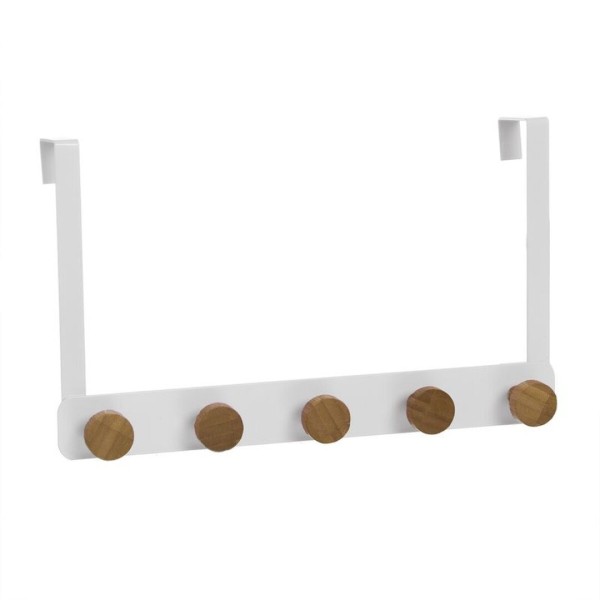 Perchero práctico y decorativo, ideal para aprovechar el espacio detrás de la puerta sin necesidad de taladros. Fabricado en metal lacado en color blanco con colgadores de bambú natural, combina funcionalidad y estilo en una sola pieza. Medidas: 33x7,5x20 cm.