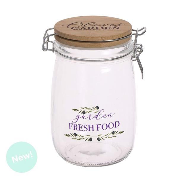 Bote de cristal con tapa de bambú. Medidas: 11,5x11,5x15,5 cm.