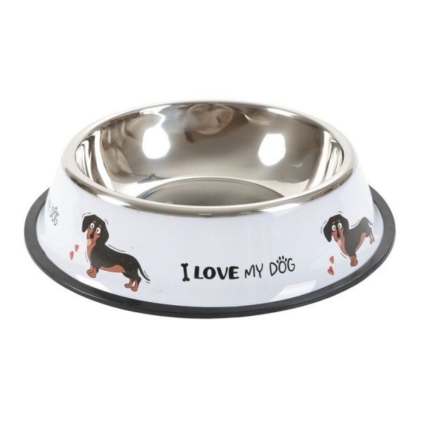 Un comedero práctico, estable y con un diseño encantador para tu mejor amigo peludo. Su cuenco interior de acero inoxidable garantiza higiene, resistencia y fácil limpieza, mientras que el exterior está decorado con divertidas ilustraciones de perritos. Medidas: 18,3 x 18,3 x 5,7 cm.
