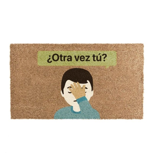Felpudo fabricado en fibra de coco natural con base antideslizante, ideal para la entrada del hogar. Diseño original inspirado en un mensaje tipo WhatsApp con la frase ¿Otra vez tú? y divertida ilustración. Medidas aproximadas: 40 x 70 cm.