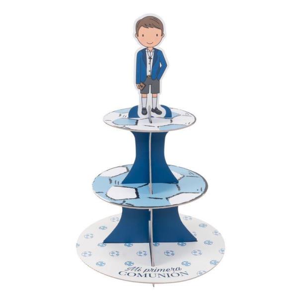 Soporte de cartón con tres niveles comunión niño para exposición de pasteles. Medidas: 30x30x38,5 cm.
