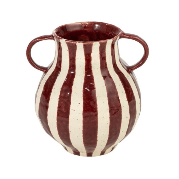 Jarrón decorativo fabricado en cerámica con acabado en tonos burdeos y beige, diseño de rayas verticales y elegante forma redondeada con doble asa lateral. Medidas aproximadas: 18,5 x 16,5 x 19 cm.