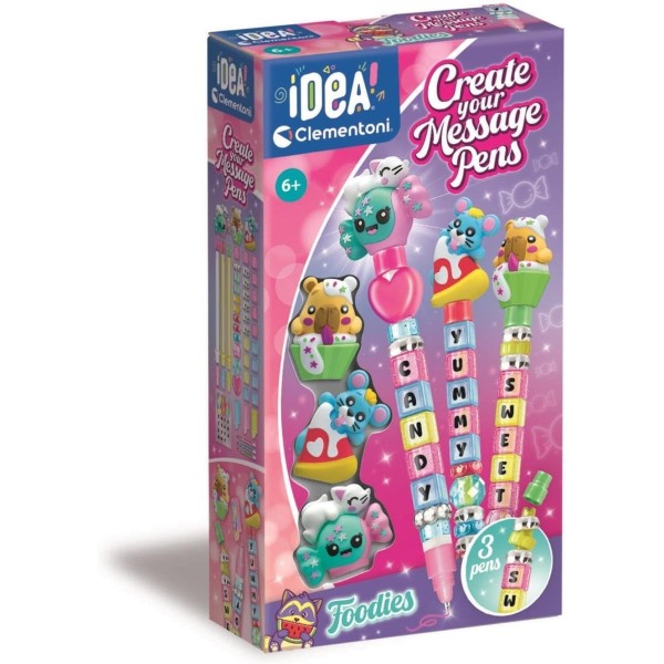 Set creativo que permite montar y personalizar 3 bolígrafos con divertidos mensajes giratorios y adorables figuras inspiradas en el mundo de la comida. A partir de 6 años.