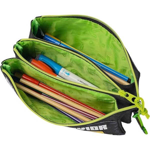 Portatodo fabricado en poliéster resistente. Cuenta con tres compartimentos independientes con cierre de cremallera, perfectos para separar bolígrafos, lápices, rotuladores u otros pequeños accesorios, facilitando el orden y el acceso rápido a cada objeto. Medidas: 22 x 11 x 4 cm.