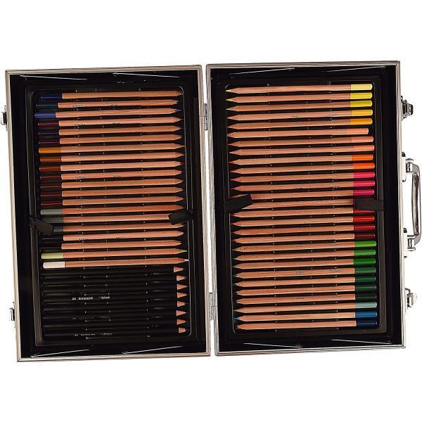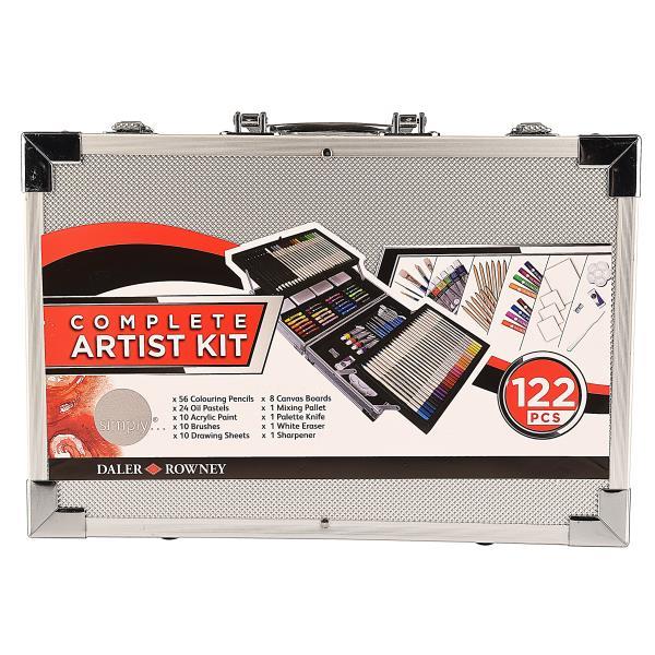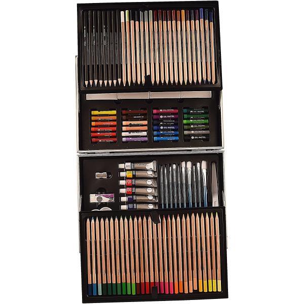 Set de pintura de 122 piezas. Incluye 56 lápices de colores, 24 pasteles de aceite, 10 pinturas acrílicas, 10 pinceles, 10 hojas de dibujo, 8 tablas de lona, 1 paleta de mezcla, 1 cuchillo de paleta, 1 borrador de color blanco, 1 sacapuntas.