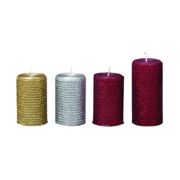 Vela cilíndrica con brillo. Color rojo. Medida 5x7,5cm.