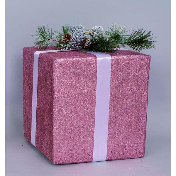 Paquete de regalo de poliestireno de color rosa decorado con cinta blanca y rama de piñas en la parte superior. Medida: 24 cm.