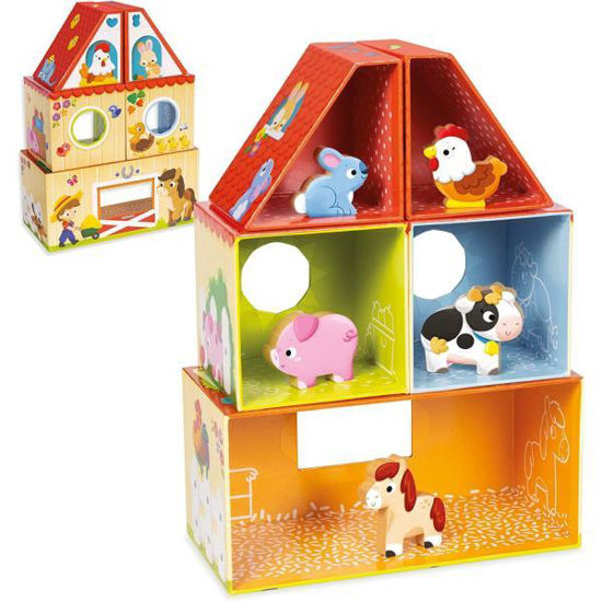 Juego infantil con bloques para construir una granja. Contiene 5 cubos de cartón y 5 animales de madera. Edad recomendada +12 meses.