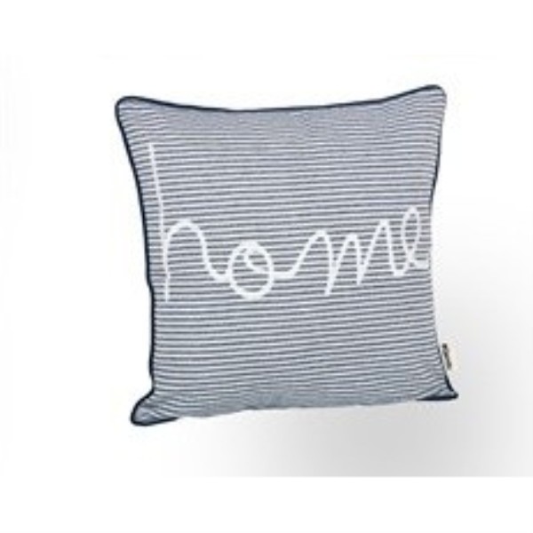 Cojín cuadrado decorativo con diseño de rayas en color marino y la palabra “home” bordada en el frente. Ideal para aportar un toque acogedor y moderno al salón, dormitorio o cualquier rincón del hogar. Medidas: 45x45 cm.