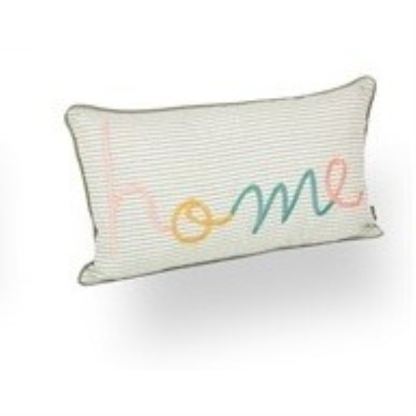 Cojín decorativo rectangular de 30 x 50 cm con diseño a rayas finas y la palabra “Home” bordada en colores suaves.