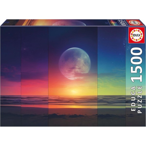 Puzzle de 1500 piezas con un espectacular paisaje de fases cósmicas y colores degradados, con unas dimensiones de 85 x 60 cm una vez completado.
