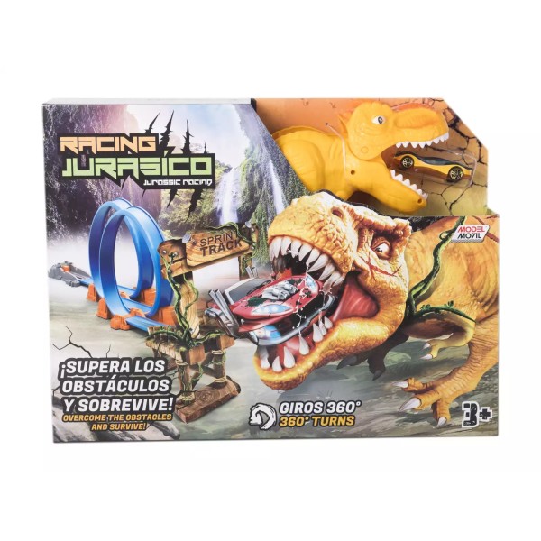 ¡Prepárate para una carrera al límite! El circuito Racing Jurásico es pura adrenalina y diversión prehistórica. Coloca tu coche en el lanzador, pulsa... ¡y observa cómo acelera a toda velocidad para enfrentarse a los loopings dobles, una rampa de madera y al temible dinosaurio que intentará atraparlo! A partir de 3 años.