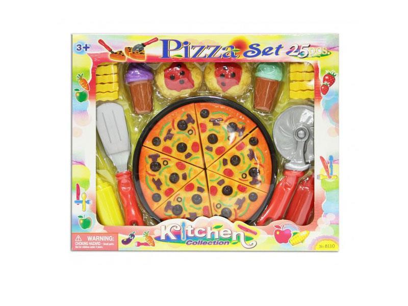 Pizza de juguete con accesorios. Su medida es de 38 x 31 x 5 centímetros y tiene un total de 25 piezas. Está indicado para mayores de 3 años.