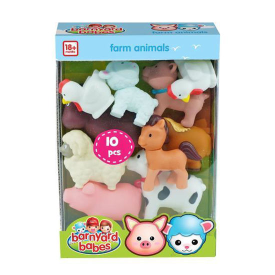 Pack con 10 animales de la granja blanditos. Edad recomendada +18 meses.