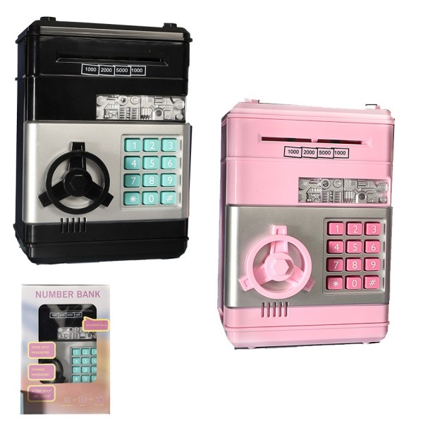 La hucha electrónica con contraseña enseña a los niños la importancia del ahorro mientras se divierten. Medidas: 14 x 21 x 14 cm. Disponible en dos colores: negro y rosa.
