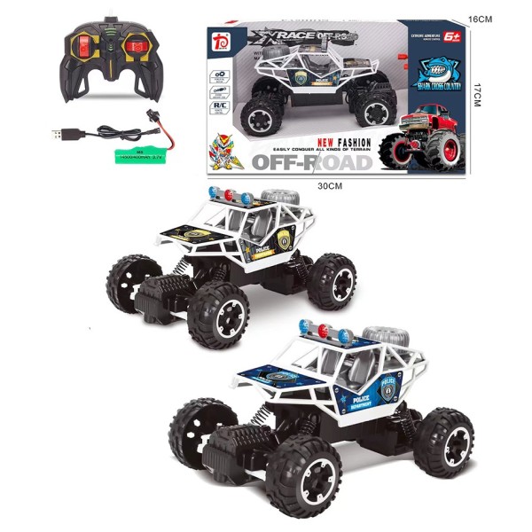 Enfréntate a cualquier terreno con este coche todoterreno de policía a control remoto, con luces LED, suspensión resistente y batería recargable USB. Ideal para niños a partir de 6 años. Disponible en dos modelos. Medidas: 30 x 17 x 16 cm.