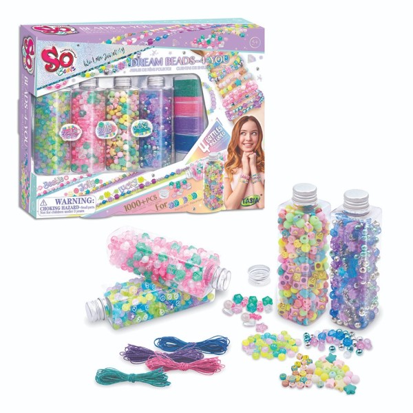 Crea joyas únicas y coloridas con este kit de más de 1000 abalorios en 4 botellas llenas de cuentas, hilos y accesorios. Medidas: 32 x 25 x 5 cm.