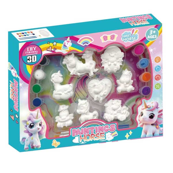 Con este divertido set de pintura los pequeños artistas podrán dar vida a simpáticas figuras de unicornios. Medidas del set: 31 x 24 x 3 cm.