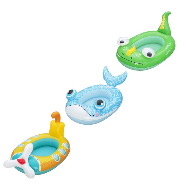 Barca hinchable infantil surtida con divertidos diseños de animales, ideal para que los más pequeños disfruten del verano en piscina o playa. Con unas dimensiones de 108 x 65 cm, ofrece el tamaño perfecto para que los niños se sienten cómodamente y jueguen con mayor estabilidad en el agua.