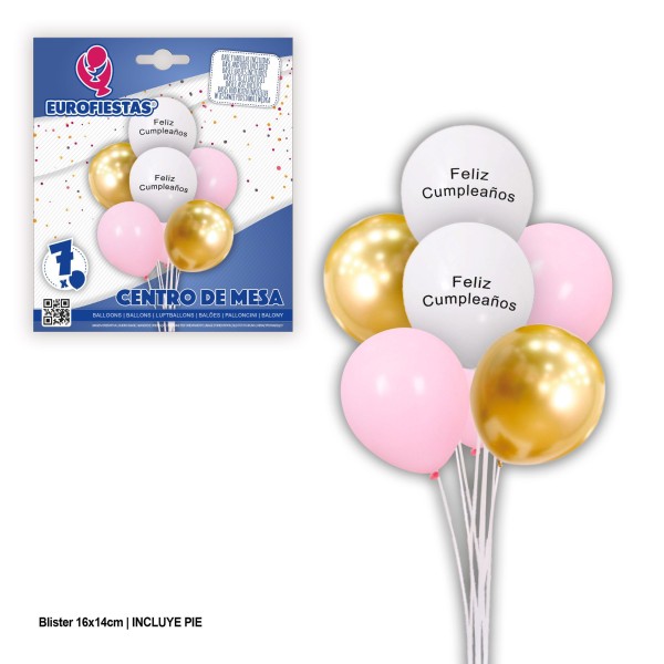 CENTRO MESA GLOBLOS 7PZ FELIZ CUMPLEAÑOS BLANCO/ROSA/ORO