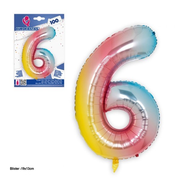 Haz que cualquier cumpleaños o celebración destaque con este espectacular globo foil número 6 de 100 cm. Su acabado metalizado con degradado en tonos rosa, azul y amarillo aporta un toque moderno, divertido y muy llamativo.