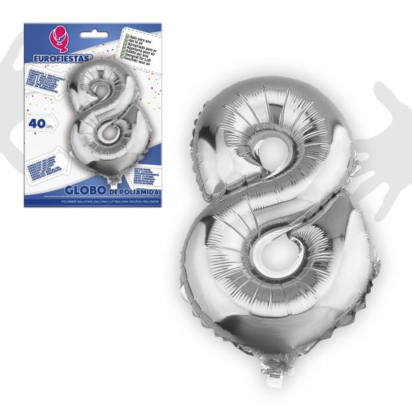 Globo de poliamida número 8 en color plateado. Medida: 40 cm.