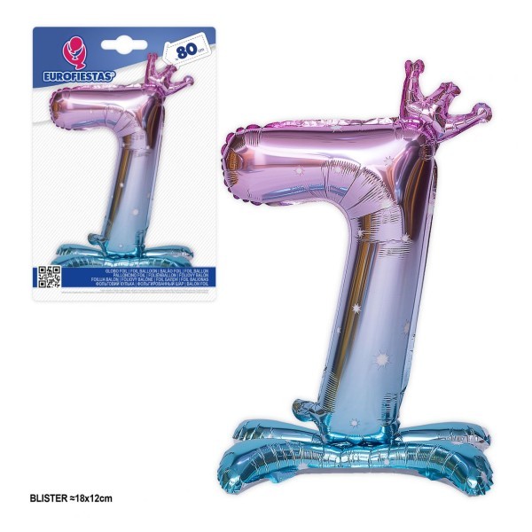 Celebra un cumpleaños inolvidable con este globo número 7 de foil en tonos metalizados rosa y azul, decorado con una preciosa corona en la parte superior. Altura aproximada: 80 cm.