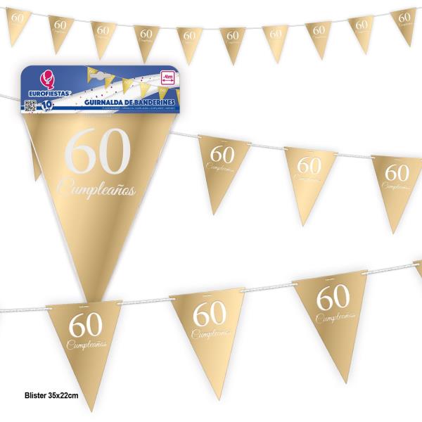 Guirnalda con 10 banderines dorados 60 cumpleaños. Medidas: 400 cm.