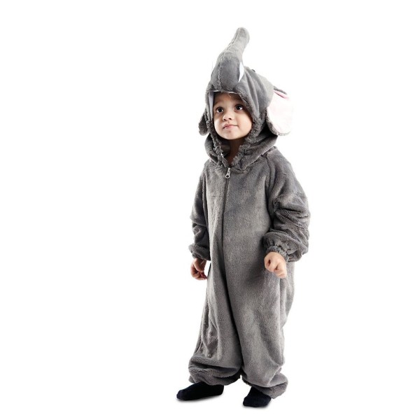 Disfraz de elefante para bebé. El traje es un mono suave y calentito con cierre frontal y una capucha con orejas y trompa. Talla 1-2 años.