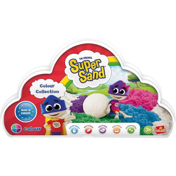 Crea y construye con la arena mágica Super Sand. Incluye 200 g de arena blanca y 200 g de arena color. Edad recomendada +3 años.