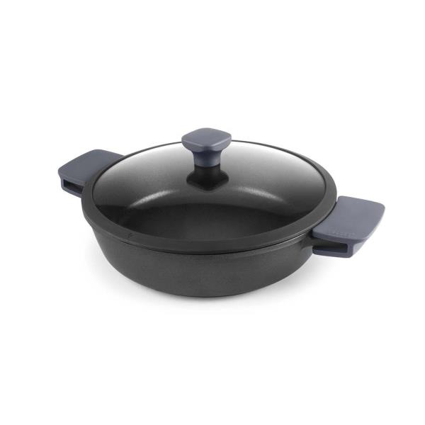 Guisera fabricada en aluminio fundido con tapa de cristal y borde de silicona. Incluye asas de silicona. Apta para cocinas de inducción, vitrocerámica, eléctrica y gas. Medidas: 24 cm.