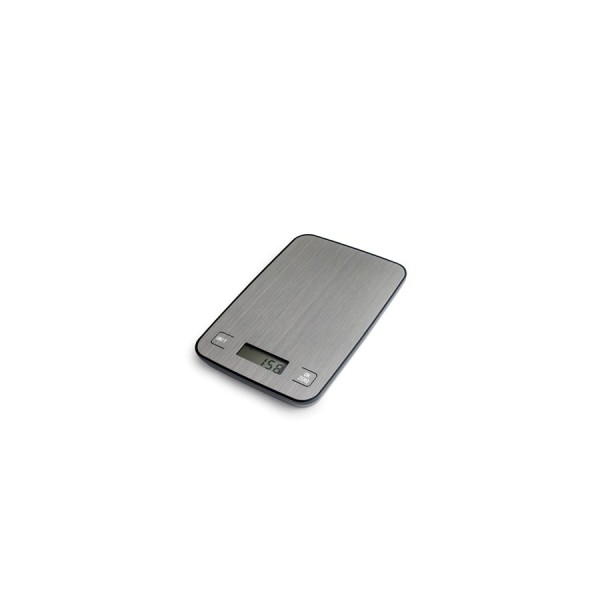 Báscula mini de cocina fabricada en acero inoxidable. Pantalla digital con función tara y cambio de unidades. Capacidad máxima: 5 kg.