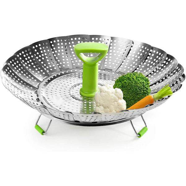 Cestillo de acero inoxidable con mango de silicona para poder preparar al vapor todo tipo de verduras. Gracias a que se pliega, se adaptará facilmente a todas tus cazuelas e incluso a la cantidad que desees cocinar. Los apoyos están recubiertos de silicona para evitar el rayado de tus cazuelas y el asa de silicona evitará que te quemes. Fácil de limpiar y guardar. Medida 28cm como máximo y 20 cm como mínimo.