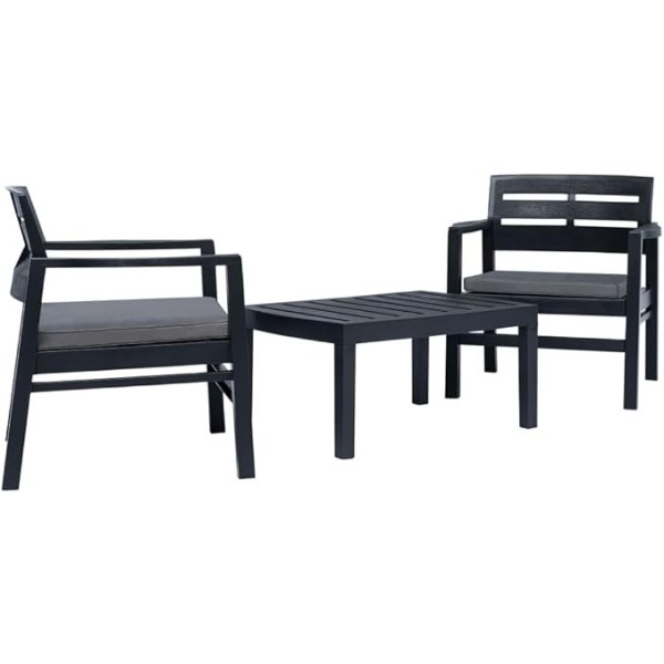 Conjunto de jardín compuesto por 2 sillones con cojines y 1 mesa de centro, ideal para espacios exteriores o terrazas. Fabricado con polipropileno resistente. Medidas de sillones de 72,5 x 65 x 74,5 cm y mesa de 78 x 55 x 38 cm.