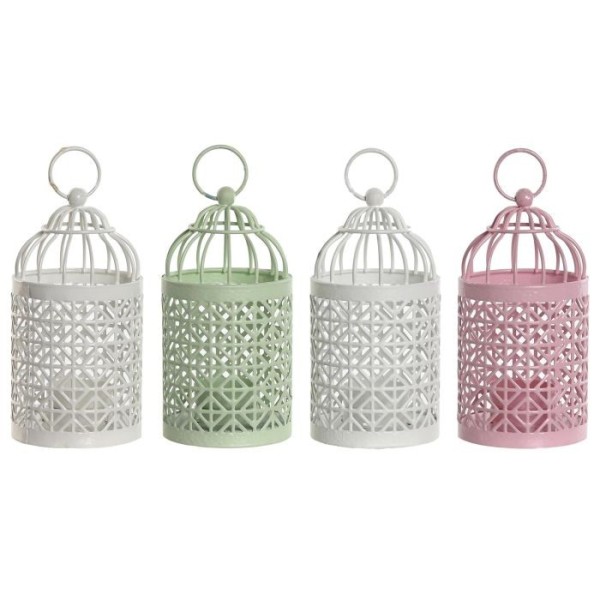 Portavela decorativo de hierro calado, ideal para crear ambientes cálidos y acogedores con velas. Diseño tipo jaula en colores suaves. Disponible en varios colores. Medidas: 8x8x15 cm.