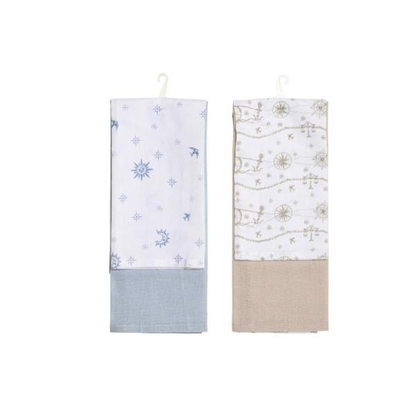 Juego de dos paños de cocina de algodón de 180 g/m², absorbentes y resistentes, ideales para el uso diario. Su tamaño de 60 x 40 cm los hace perfectos para secar, limpiar y manipular utensilios. Disponible en dos colores (azul-marrón), puede indicar el modelo deseado en el comentario del articulo.