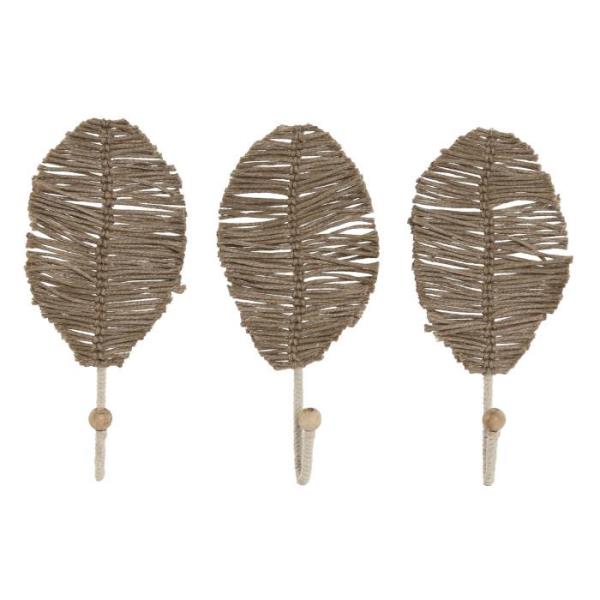 Set de 3 percheros con diseño de hoja, fabricados en yute y metal para un estilo rústico y elegante. Medidas: 12 x 4 x 26 cm cada uno. Ideales para colgar abrigos, bolsos o accesorios.