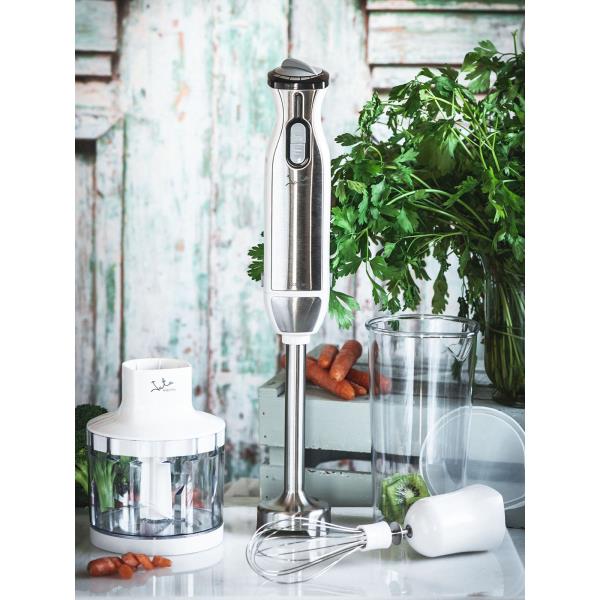 Batidora de varilla inoxidable con doble cuchilla de titanium de gran solidez con regulador electrónico de velocidad con indicador de iluminación mientras está funcionando. Potencia de 1000w de fácil trituración. Pie de acero inoxidable desmontable. Incluye varios accesorios como batidor de acero inoxidable, una picadora de cuchilla de acero inoxidable y un vaso medidor con tapa 600 ml. Garantía: todos los productos de jata incluye 3 años de garantía.