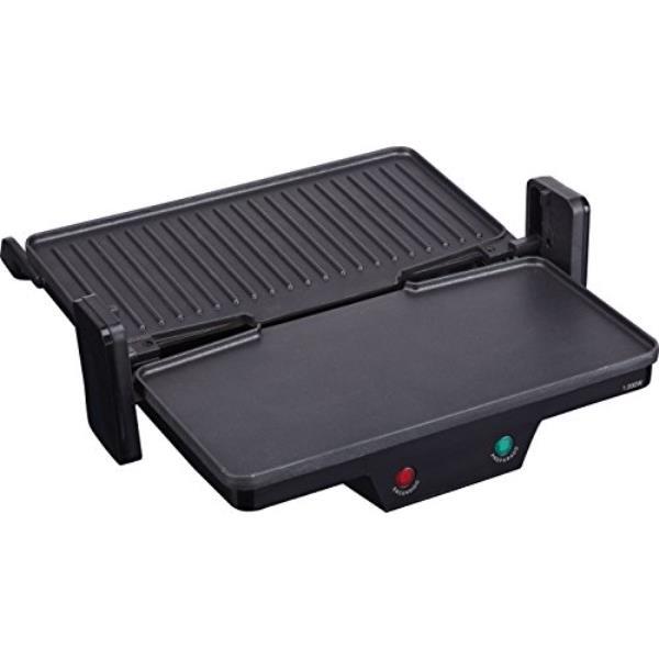 Este grill cuenta con placas mixtas de 27x14 cm. y una placa superior que se puede abrir 180º, permitiendo cocinar en horizontal también sobre ella o, si se prefiere, cerrarla y así cocinar los alimentos por su parte superior (es especial para hamburguesas, entrecot, pescados y sándwiches) Si ambas placas quedan extendidas la superficie total es de 27x 29 cm. Las placas llevan un recubrimiento antiadherente que está libre de PFOA. Potencia 1000W. Incluye: asa de apertura toque frío , 2 pilotos luminosos independientes: encendido / preparado y bandeja recoge salsas