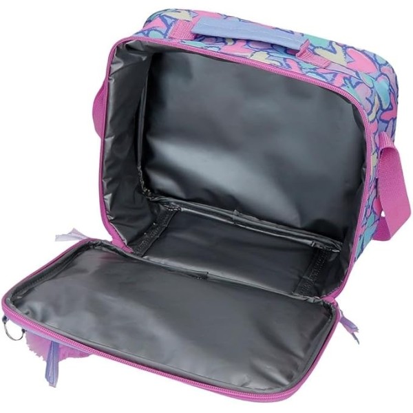 Portamerienda térmica de 25 x 21 x 11 cm fabricada en poliéster, ideal para mantener los alimentos a buena temperatura durante más tiempo. Cuenta con un compartimento principal con cremallera, bolsillo frontal para pequeños accesorios y varias formas de transporte gracias a su asa superior y bandolera ajustable.