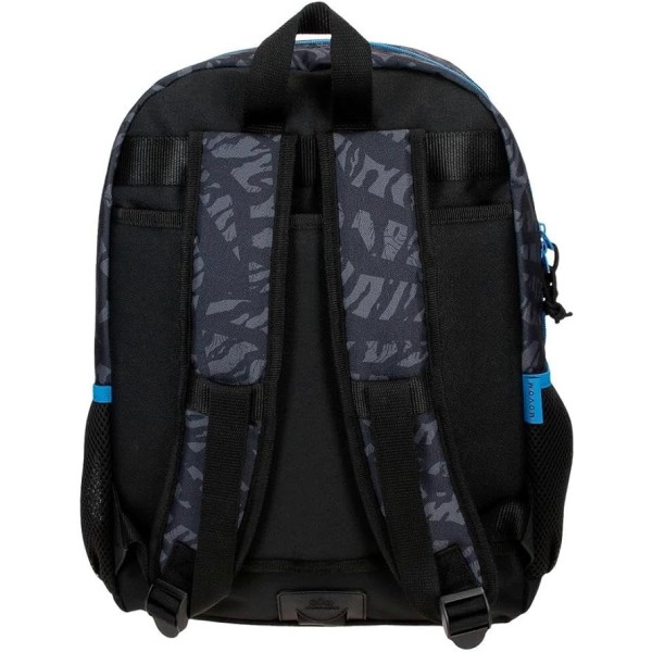 Mochila de 30 x 40 x 13 cm fabricada en poliéster, con amplio compartimento principal y múltiples bolsillos que facilitan una organización práctica del material escolar. Incluye bolsillos frontales, bolsillo interior y laterales, además de banda trasera con sistema Magic Fix para adaptarla a un carro opcional y mejorar su transporte.