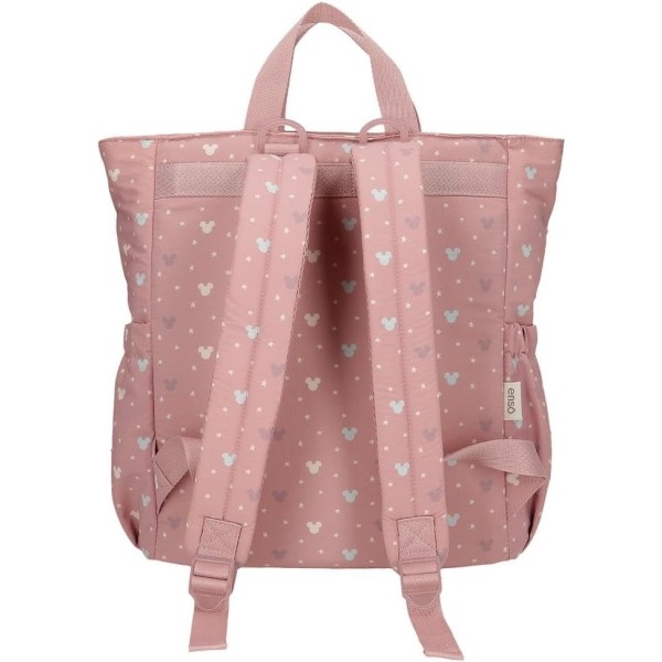 Mochila amplia y funcional, ideal para el día a día con el bebé. Fabricada en poliéster resistente, cuenta con un gran compartimento principal con cierre de cremallera para mantener todo organizado y accesible. Incluye dos bolsillos laterales perfectos para botellas o biberones, además de dos compartimentos interiores: uno con varios bolsillos para organizar pequeños accesorios y otro plastificado, ideal para ropa húmeda. Sus tirantes ergonómicos y ajustables garantizan máxima comodidad en el uso diario. Medidas: 32 x 35 x 13 cm.