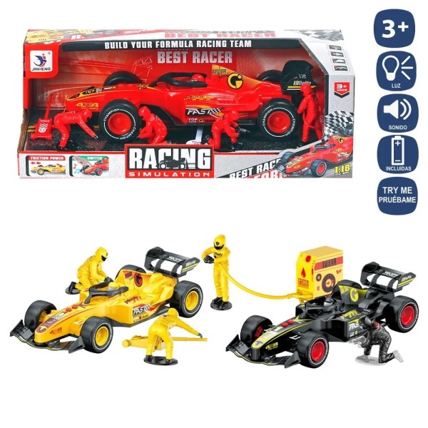 Coche de carreras con luz y sonido, figura de mecánico y accesorios para simular una auténtica parada en boxes. Disponible en 3 modelos. A partir de 3 años.