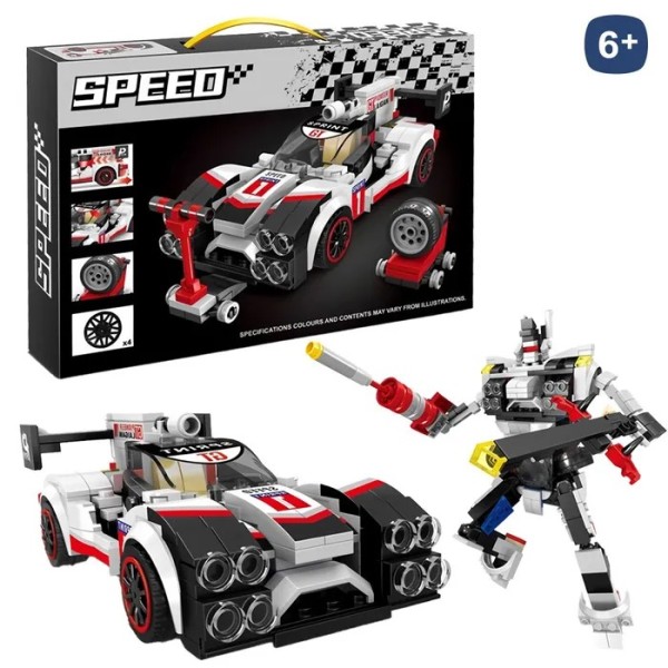 Set de construcción con piezas tipo bloque para armar un coche de carreras o transformarlo en un robot articulado. Incluye accesorios y ruedas intercambiables. Recomendado para niños a partir de 6 años.