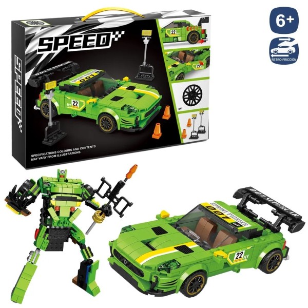Set de construcción con piezas tipo bloque para armar un coche de carreras o transformarlo en un robot articulado. Incluye accesorios y ruedas intercambiables. Recomendado para niños a partir de 6 años.