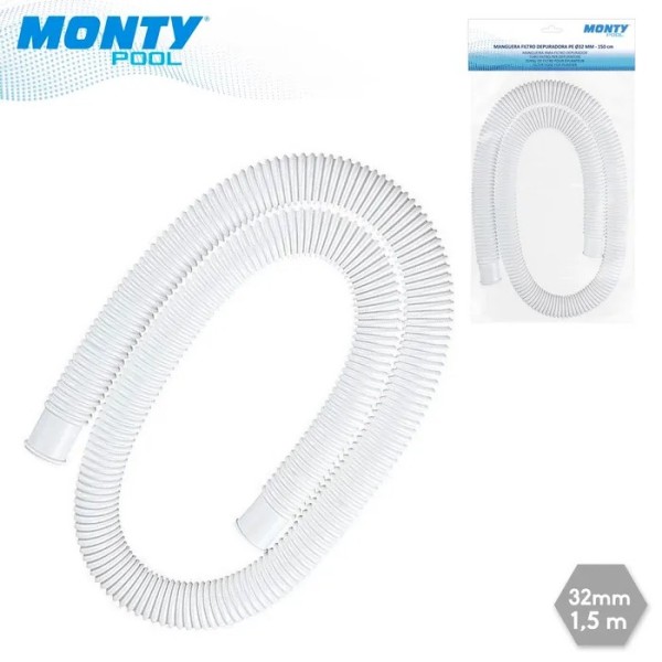 Manguera flexible diseñada para conectar la depuradora a tu piscina de forma segura y eficiente. Con una longitud de 1,50 metros y diámetro de 32 mm. Es apta para depuradoras de hasta 2.000 litros por hora.
