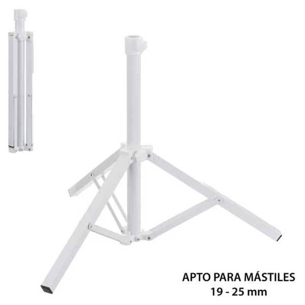 Práctico y resistente pie de parasol tipo trípode con 3 patas, ideal para terrazas, jardines y patios. Con unas dimensiones de 74 x 74 x 46 cm, ofrece buena estabilidad gracias a sus patas de 37 cm de longitud, diseñadas para un apoyo equilibrado. Cuenta con sistema regulable en altura (hasta 46 cm) y ajuste mediante rosca, siendo compatible con mástiles de 19 a 25 mm de diámetro.
