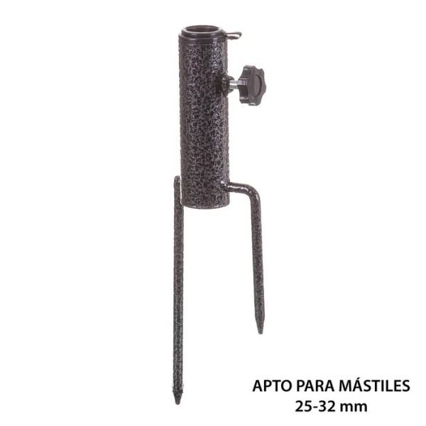 Práctico y resistente pie para parasol, ideal para fijar sombrillas directamente en tierra o césped del jardín. Fabricado en metal robusto, garantiza estabilidad y sujeción firme gracias a sus dos patas de anclaje que se clavan fácilmente en el suelo. Apto para mástiles de 25 a 32 mm.