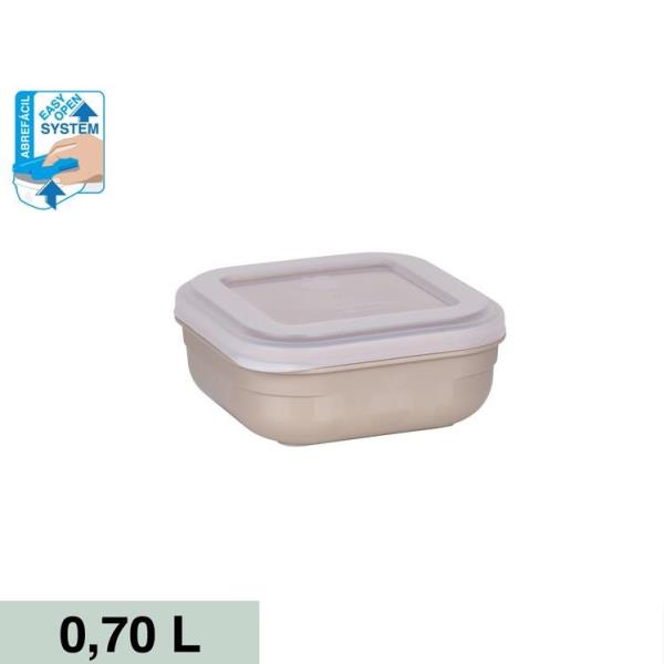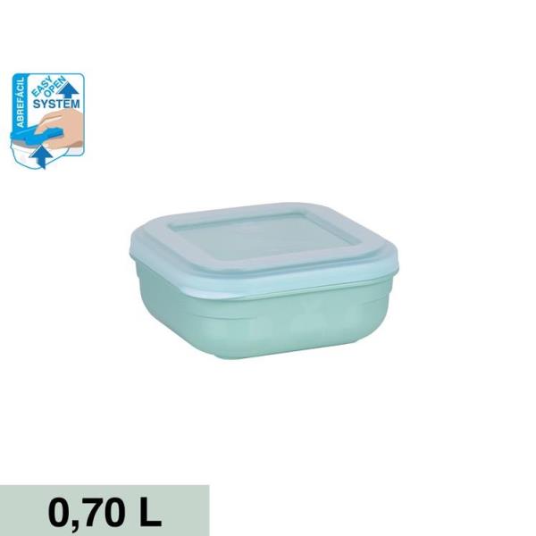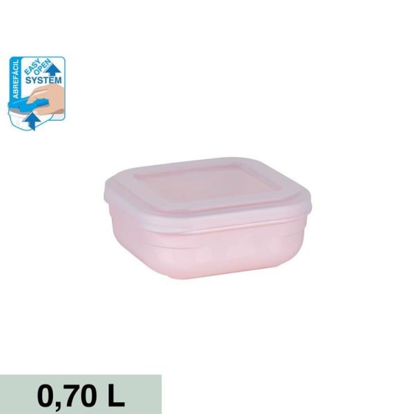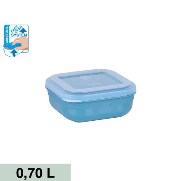 Fiambrera con tapa abre fácil de 0,7 litros. Disponible en varios colores (azul-rosa-marrón-azul pastel), puede indicar el modelo deseado en el comentario del articulo.